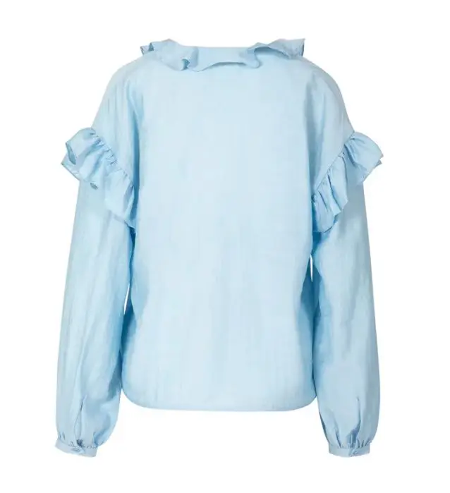 Designed in a loose, relaxed shape, this blouse slips effortlessly over the head for easy, comfortable wear. The elegant V-neckline is framed with soft volants that add gentle movement, while the long sleeves feature subtle shoulder frill detailing and a beautifully draped shape through the arm for a flattering, fluid line.