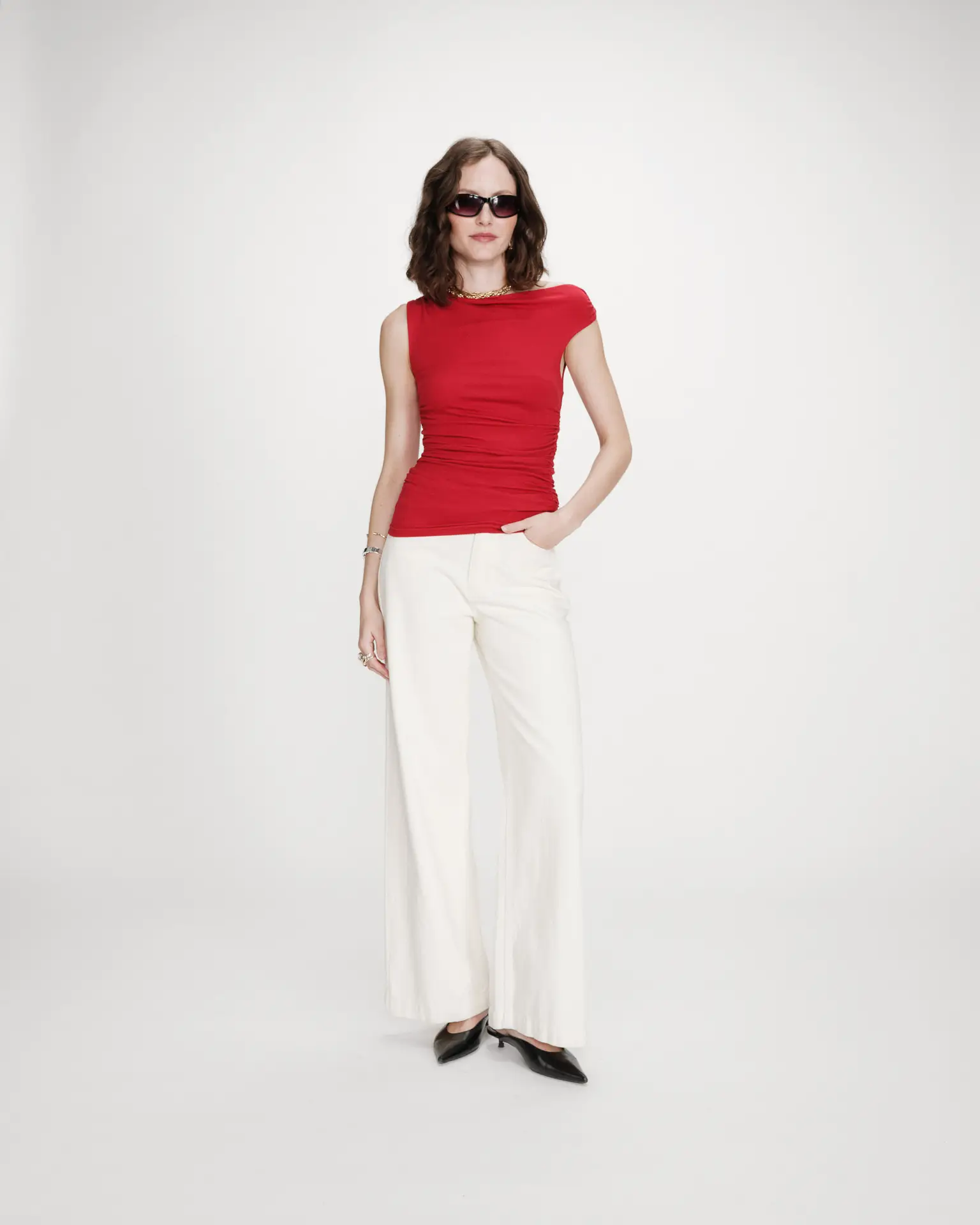 This top is crafted from a soft viscose jersey blended with a touch of elastane for comfort and fluidity. The high viscose content gives the fabric its signature drape, allowing it to fall effortlessly over the body with a smooth, silk-like touch. It feels cool against the skin, breathable, and beautifully lightweight, making it ideal for both elevated daywear and evening styling.