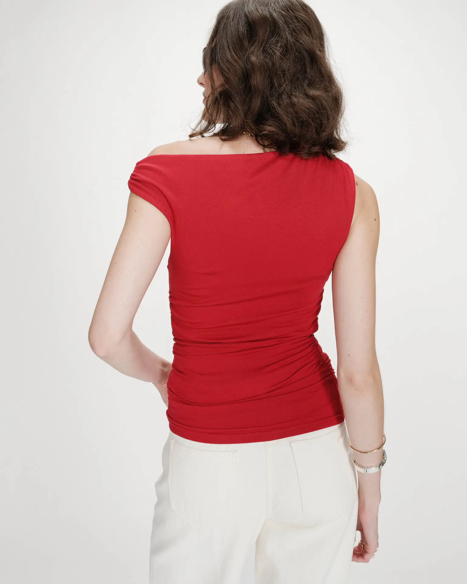 The VODIA draped top is designed with a flattering fitted cut that gently contours the body while remaining comfortable and easy to wear. The asymmetrical one-shoulder neckline creates a modern, sculpted line across the collarbone, drawing the eye upward and adding an elegant edge.